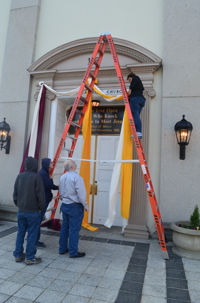 Decorating front door. (LtoR) Br. Tom McMahon, Grand Knight Bob Krajewski, Br. Joe Swiss and Amy Spessard (on ladder).