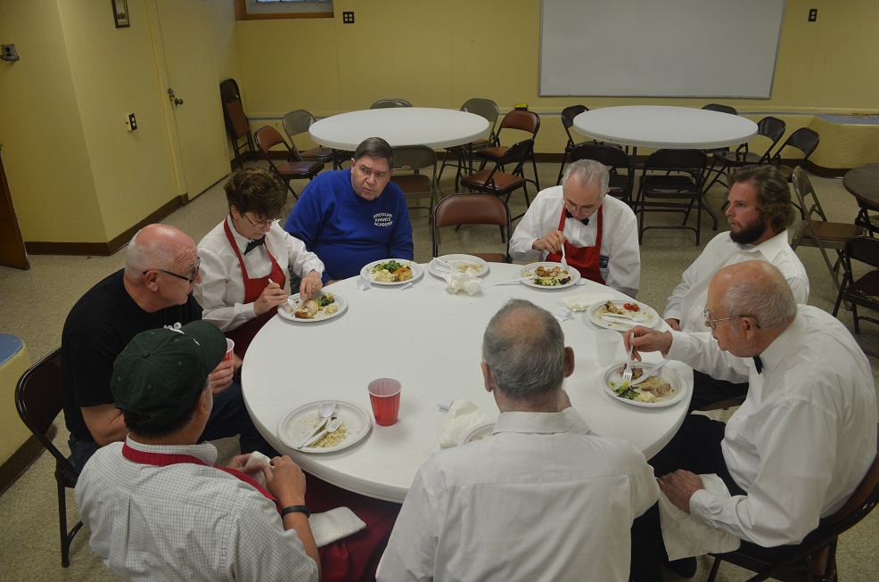 Volunteer's meal (Clockwise from left): Grand Knight Bob Krajewski (in black), Cindy Satterfield, Br. Mike Willett (in blue) and Br. Jose Valcarcel (San Juan Bosco Council #14726), Kevin McDonnell, PGK Bob Morrow, Br. Tom McMahon (facing away), Br. Maurice Wong (facing away).