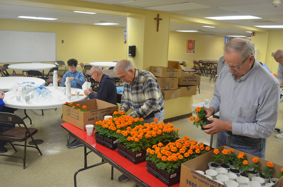 (LtoR) Cindy Satterfield and Grand Knight Bob Krajewski labeling cups at table. Br. Woody Johnston and Br. Bob Willson potting flowers.