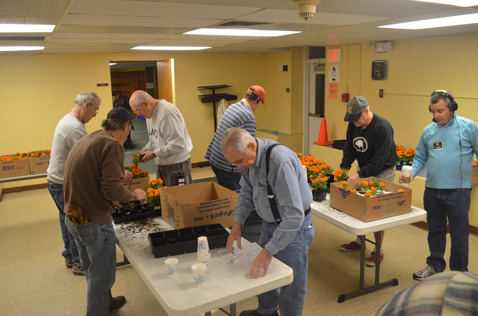 Potting flowers. Left table (clockwise): Br. John Satterfield (brown shirt), Br. Tom McMahon, PGK Bob Morrow, and PGK Julio Valcarcel (San Juan Bosco Cncl 14726).