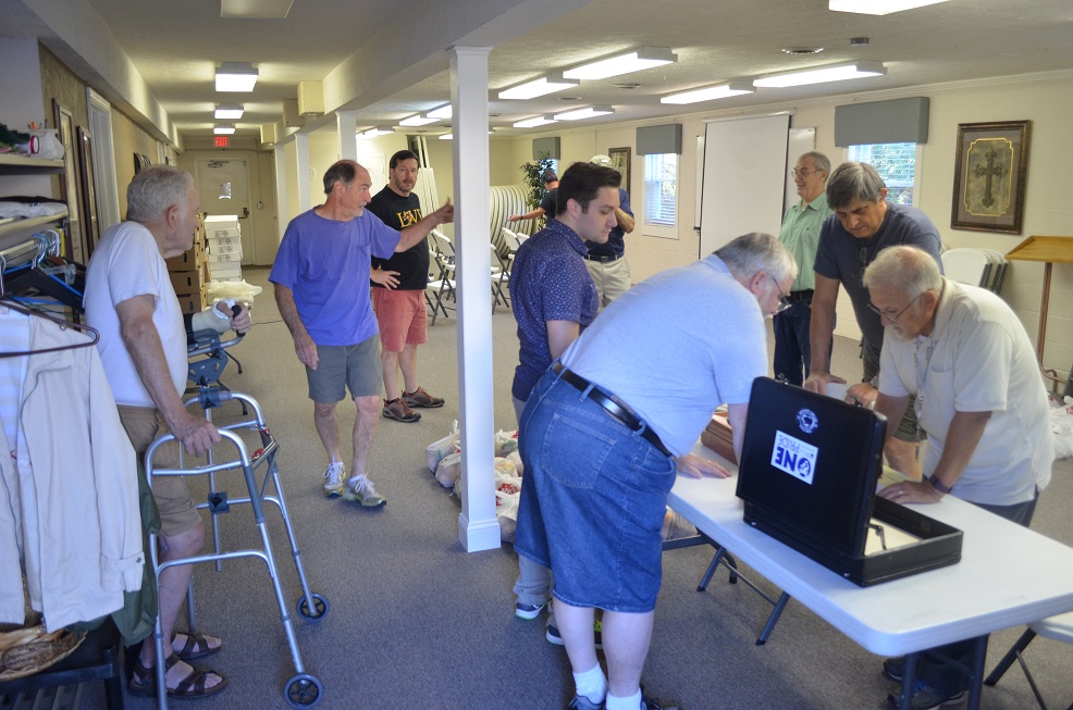 (LtoR): PGK Dick Putney with walker, Br. John Satterfield in blue shirt, Br. Lee Ericksen in black shirt, two unknown clients, Br. Tom McMahon in rear in light green shirt, Br. Jim Schabelski Sr., and Br. Woody Johnston.