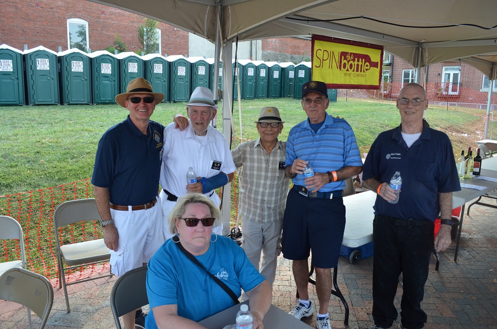 Wine tent (LtoR) in rear: Br. Mike Vaughn, PGK Dick Putney wearing an arm cast, Br. Quiredo "Reddi" Cerezo, Br. Jim Schneck and Br. Tom McMahon. An unknown volunteer in front.