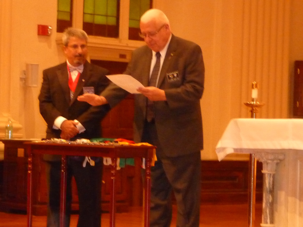 (LtoR) District Deputy Patrick Joy observes while Assistant to the Chaplain Deacon Br. Doug Nathan (Cncl 1622) blesses the jewels.