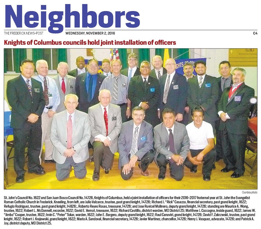 September 23, 2016, Joint Installation of Officers for St. John's Council No. 1622 and San Juan Bosco Council No. 14726, held at St. John the Evangelist Church, Frederick, MD.