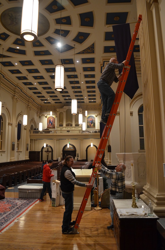 Removing Advent banners. Br. Jim Siers and Br. Woody Johnston on floor. Grand Kngiht Bob Krajewski on ladder.