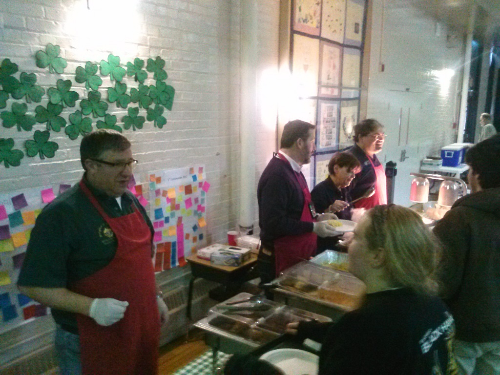 Serving line (LtoR) Br. John Widmann, Br. Lee Ericksen, Ellen Satterfield, and Br. Matt Coccagna.