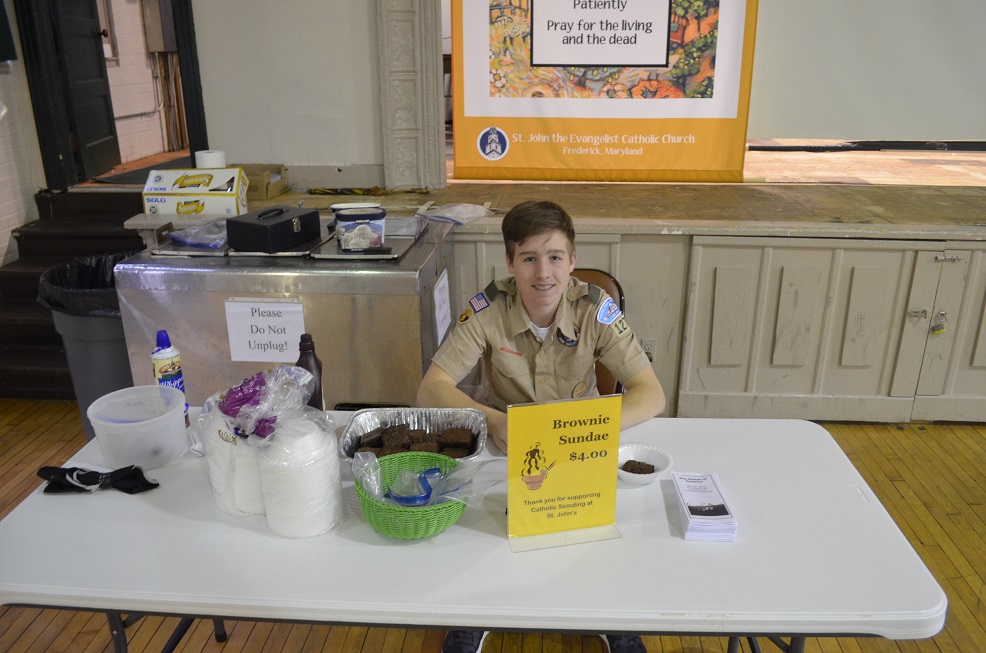 A Boy Scout sells Ice Cream Sundaes.