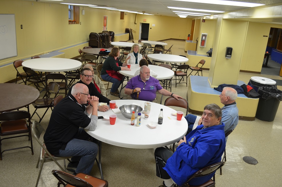 In the volunteer's lounge, (foreground around table from left) GK Bob Krajewski, Br. Jim Sier, Br. Woody Johnston (hidden behind Jim), Br. Bill Desmond, PGK Rick Casazza, and Br. Mike Willett. Far table, Janet Zakrzwski and Regina Casazza.