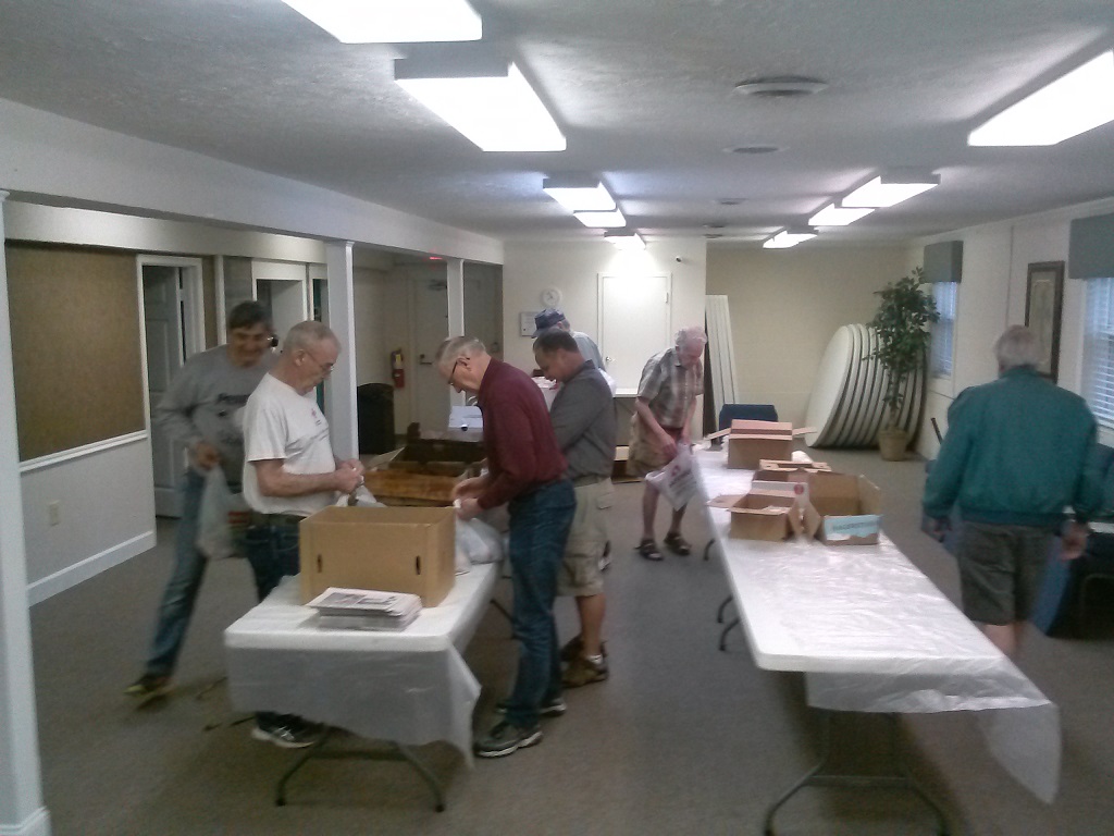 Volunteers assembling shares. (LtoR): Br. Jim Schabelski, Br. Tom McMahon, Br. Bob McDonnell, Br. Craig Giangrande, Br. Jim Schneck (hidden behind Craig), PGK Dick Putney and Br. Tom Henwood (facing away).