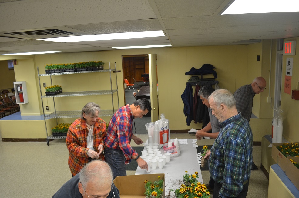 May 13, 2017 - Potting marigolds in cafeteria for our annual Mother's Day marigold distribution to mothers after Masses. Done in conjuction with San Juan Bosco Cncl #14726.