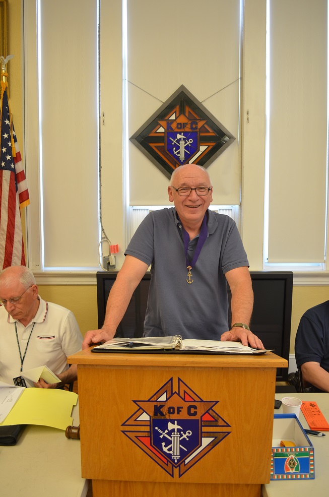 In the council chamber (LtoR), PGK Rick Casazza (Financial Secretary), Grand Knight Bob Krajewski (standing), and Deacon Br. Doug Nathan (partial, Assistant to the Chaplain).