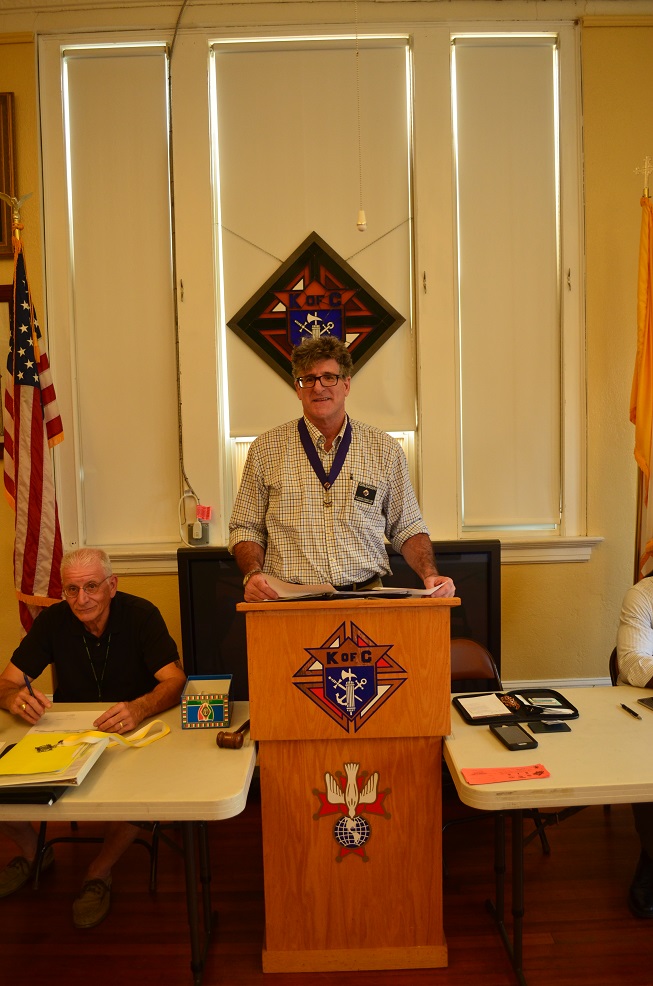 Incoming Grand Knight John Bargero (R) presides at his first meeting as Grand Knight. PGK Rick Cassaza (L) sits to left as Financial Secretary.
