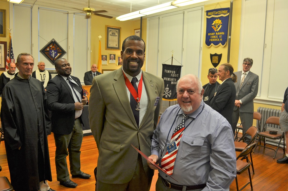 Deputy 25 Deputy Richard Castillo presents the Silver Knight Award for Outstanding Recruiting to Br. Bill Desmond.