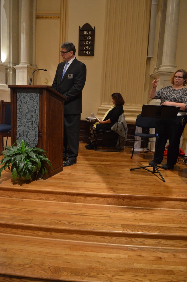 (LtoR) Grand Knight John Bargero (Cncl 1622) at podium, Vangie Quiambao sits in rear as Cantor, Amy Cutchin stands to right as sign interpreter.