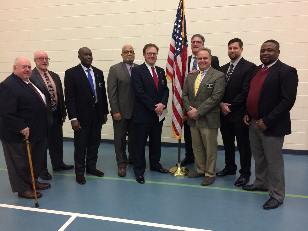 (LtoR) Left to right: Br. Bill Desmond (observer, Council Membership Chair), Br. Tom Rogers, Br. John Kouame, Br. Clint Biddle, Br. Chris Clements, flag, Br. John Bargero (observer, Grand Knight), Br. Craig Giangrande, Br. Rick Babbitt, and Br. Leonardo Onemiye. Attending Knights not present in photo: Br. Mike Vaughn and Deacon Br. Doug Nathan (observer, Assistant to the Chaplain).