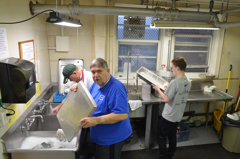 In the kitchen (LtoR): Br. Maurice Wong with green cap, Mr. Mike Willett in blue shirt and a youth volunteer.