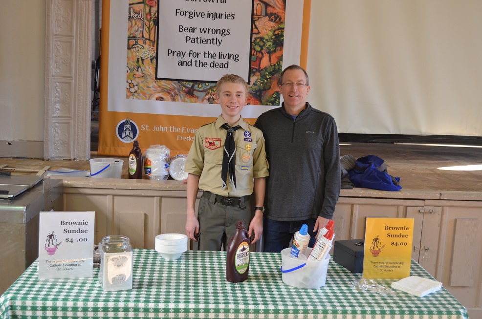 A Boy Scout and parent serving dessert.