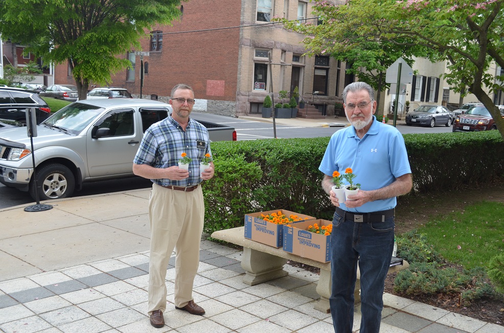 Br. Steve Davis and Br. Jim Schneck hand out marigolds after the 5pm Mass.