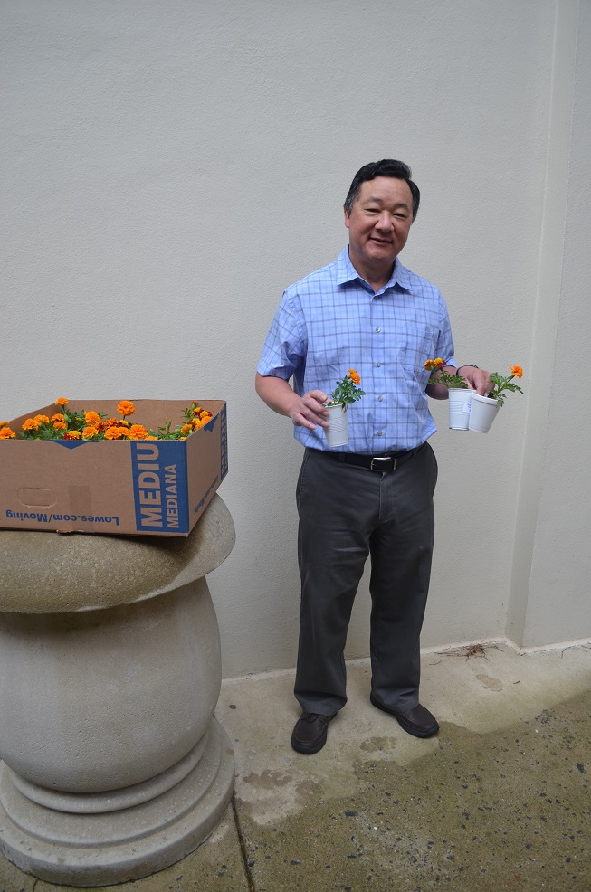 Br. Maurice Wong hands out marigolds after a Sunday morning Mass.