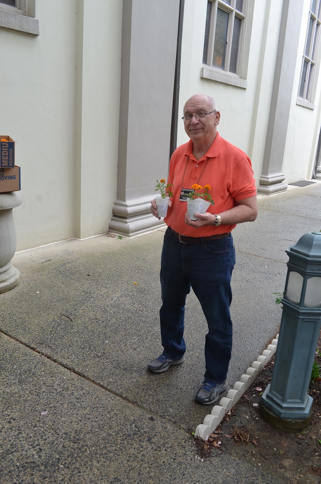 PGK Bob Krajewski, this years Mary-gold program chairman for St. John's Council, hands out marigolds after a Sunday morning Mass.