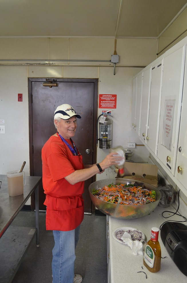 (LtoR) In the kitchen, Br. Bob McDonnell prepares some salad.