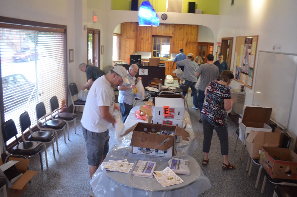 Our local SHARE site team bagging SHARES. (LtoR) Br. Bob Willson facing left, Br. Jimbo Cooper in forground, Br. Woody Johnston, a number of volunteers in rear (including Br. Jim Schneck, Br. Jim Sier and Br. Lee Ericksen), and Jane Duncan facing away.