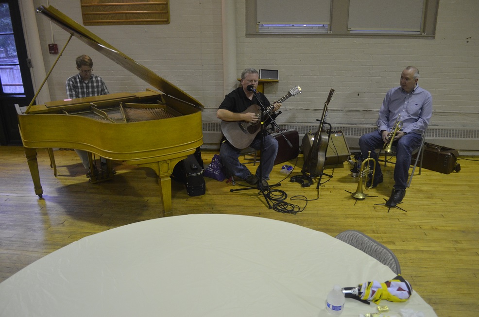 The band "Gregor and the McGregors" plays for diners. Zac Petersen on piano, Br. Greg Ross on guitar, and Mike Samborsky on trumpet. Gregor and the McGregors at this dinner. Players are also known as "The Samborsky Sound Machine" when playing jazz.