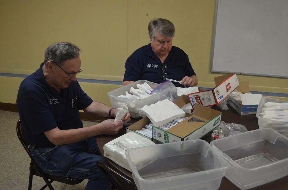 Br. Matt Meadows and Br. Bill Cutchin wrap utensils in the cafeteria.