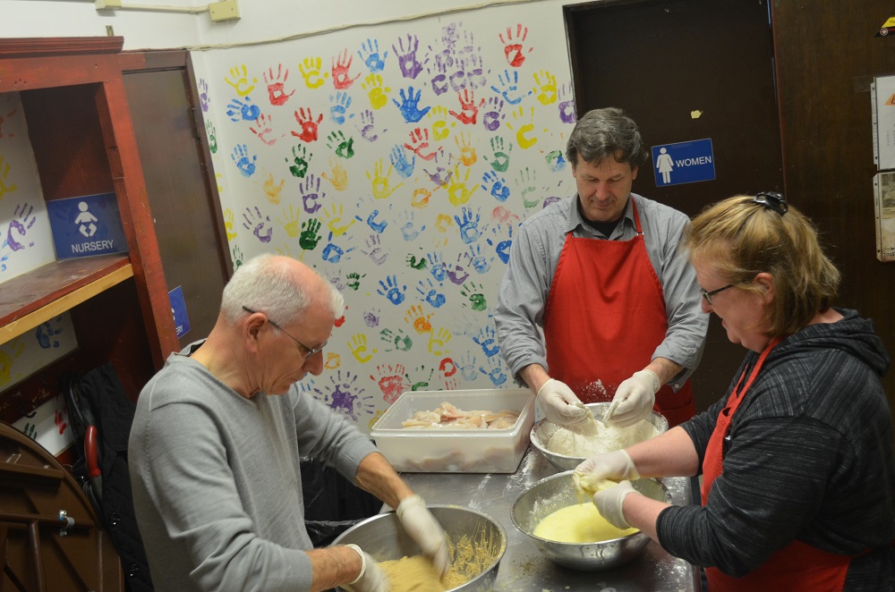 PGK Rick Casazza, Br. Lee Ericksen and Janet Zakrwski breading fish.