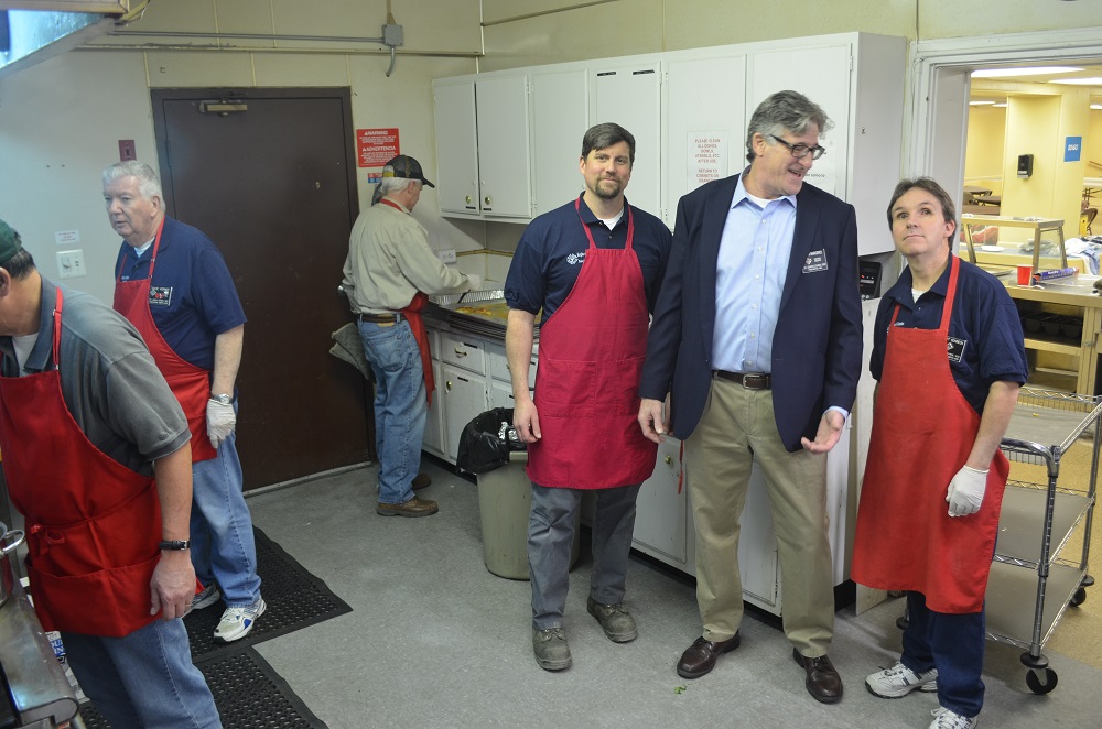 (LtoR) In the kitchen, Br. Maurice Wong (partial), Br. Dave Vernot, Br. Bob McDonnell (facing away), Br. Rick Babbitt, Grand Knight John Bargero, and Br. Robert Schneck.