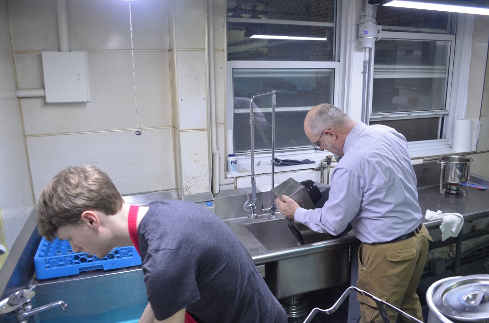 A youth volunteer and Br. John Fischer clean up in the kitchen.