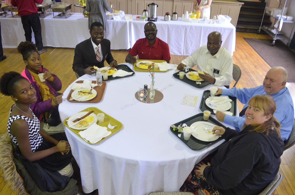 Around the table (LtoR), Sheku's two daughters, Br. Sheku Cawray, Sheku's guest, Br. Ken Jorsling, Br. Bill Desmond, and Bill's daughter.