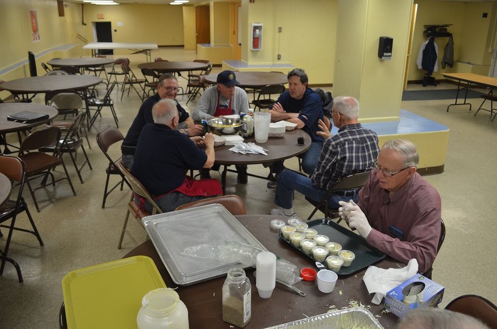 (LtoR) Br. Woody Johnston (facing away), Br. Jim Sier, Br. mike Collins, Br. Lee Ericksen, and PGK Rick Casazza (facing away) chat in the background while Br. Bob Willson makes Cole slaw.