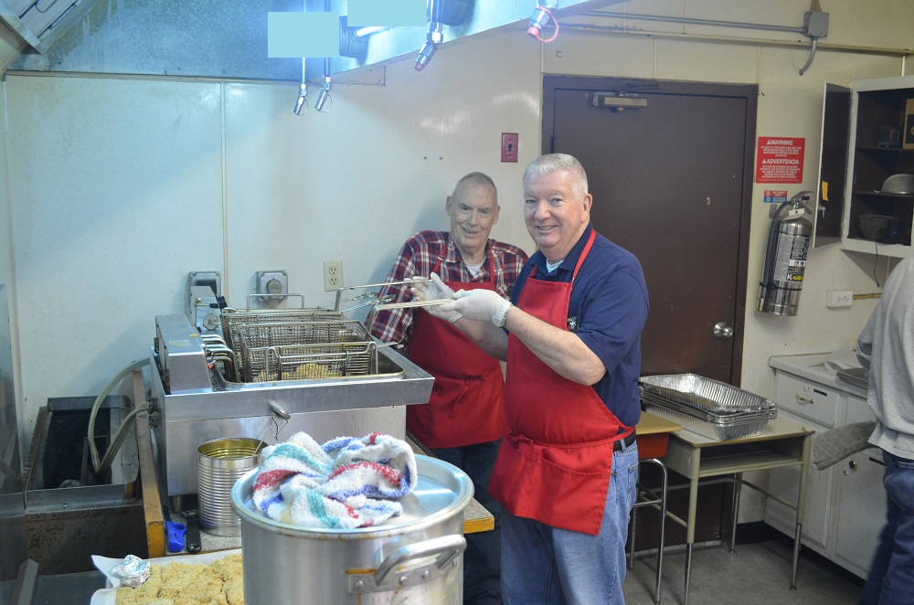 (LtoR) Br. Tom McMahon and Br. Dave Vernot frying fish and french fries in our two fryers.