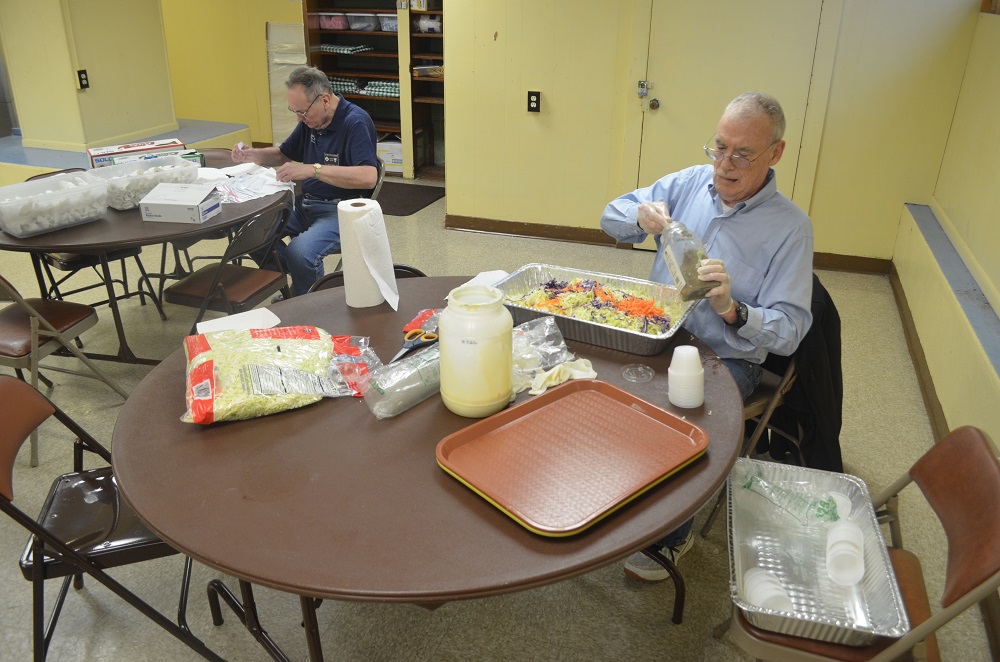 (LtoR) Br. Matt Meadows wraps utensils on rear table while Br. Tom McMahon makes Cole slaw on front table.