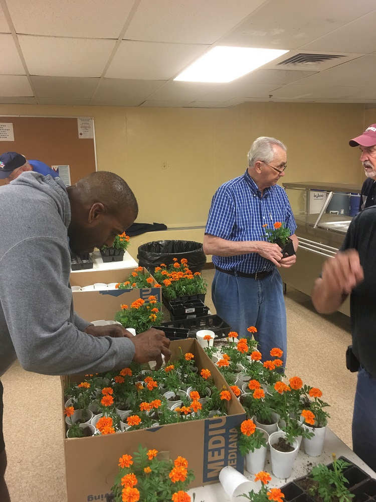 May 11, 2019, Potting Marigolds for upcoming Mothers Day in the cafeteria of the Sr. Margaret Bauer Evangelization Center, St. John the Evangelist Church, Frederick, MD.