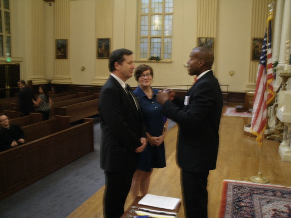 Incoming Deputy Grand Knight (1622) Lee Ericksen (L), supported by his wifw Meredith Ericksen, receives his jewel of office from District 25 Deputy Richard Castillo.