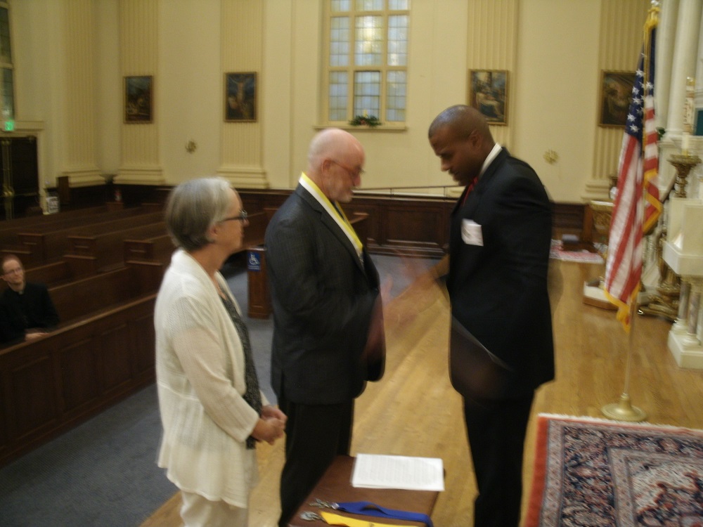Incoming Financial Secretary (1622) Tom Rogers (L), support by his wife Cathy Rogers, receives his jewel of office from District 25 Deputy Richard Castillo.
