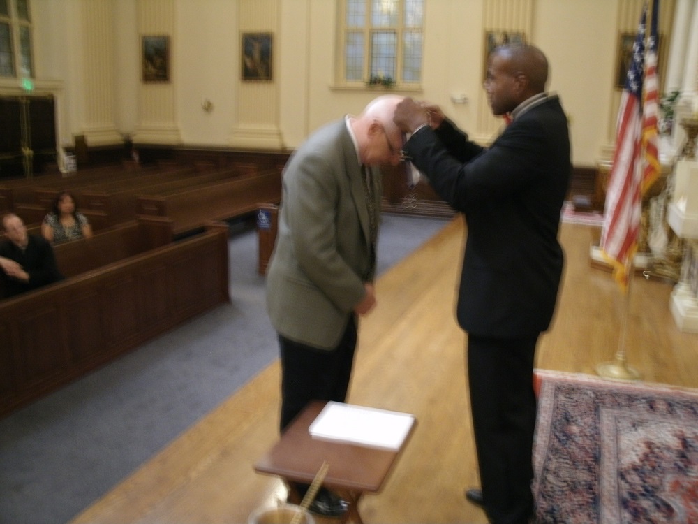 Incoming Lecturer (1622) PGK Bob Krajewski (L) receives his jewel of office from District 25 Deputy Richard Castillo.