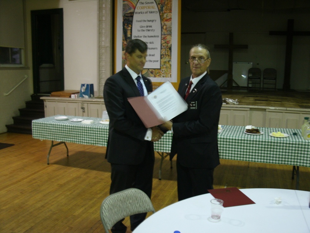 (LtoR) Grand Knight Jim Sier presents an award to Br. Woody Johnston.