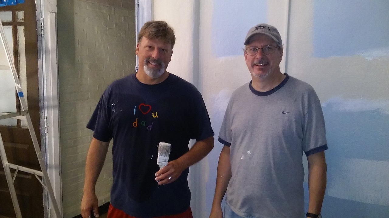 Br. Jimbo Cooper and parishioner Brett Hunt painting on the 3rd Floor hall.