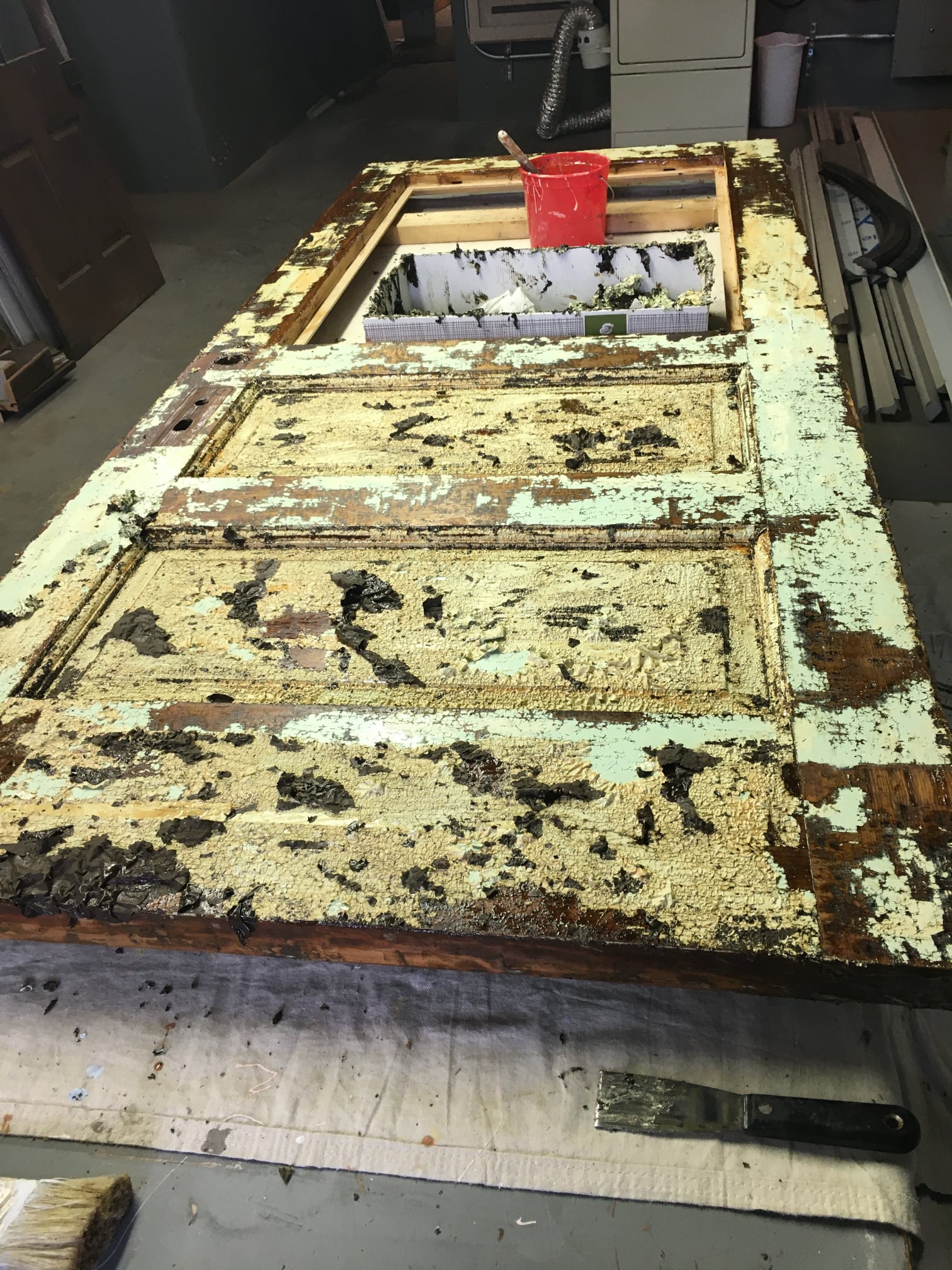 A partially stripped door.