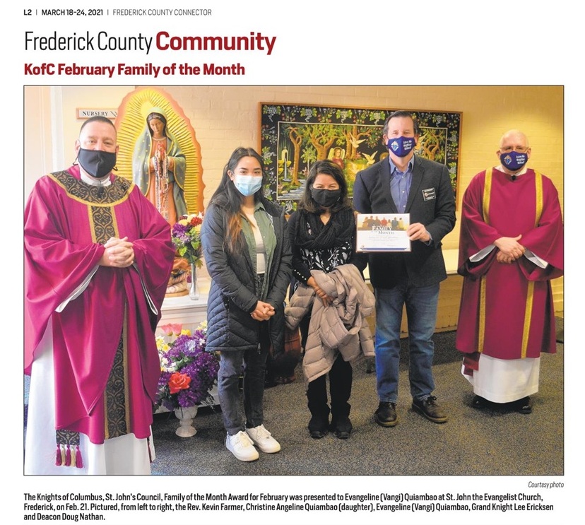January 24, 2021 - KofC St. John's Council Family of the Month Award for February 2021 to the family of Evangeline (Vangi) Quiambao.