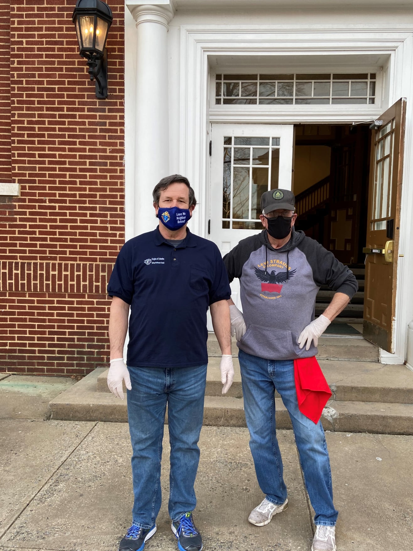 Grand Knight Lee Ericksen and Br. Bob Boehman ready to serve customers in front of the Sister Margaret Bauer Evangelization Center.