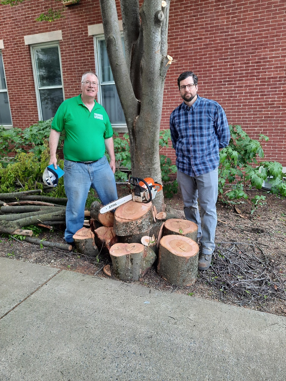 April 25, 2021, PGK Dave Satterfield and Deputy Grand Knight Rick Babbitt removing dead tree in front of St. John the Evangelist Church, Frederick, MD.