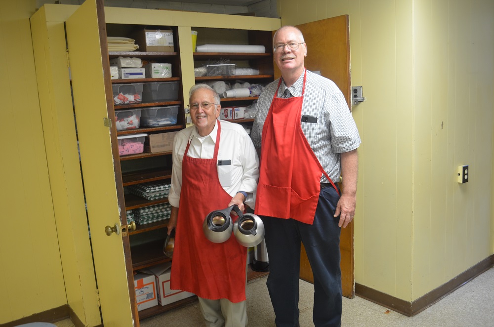 (LtoR) Br. Woody Johnston and PGK Dave Satterfield in the cafeteria getting supplies.