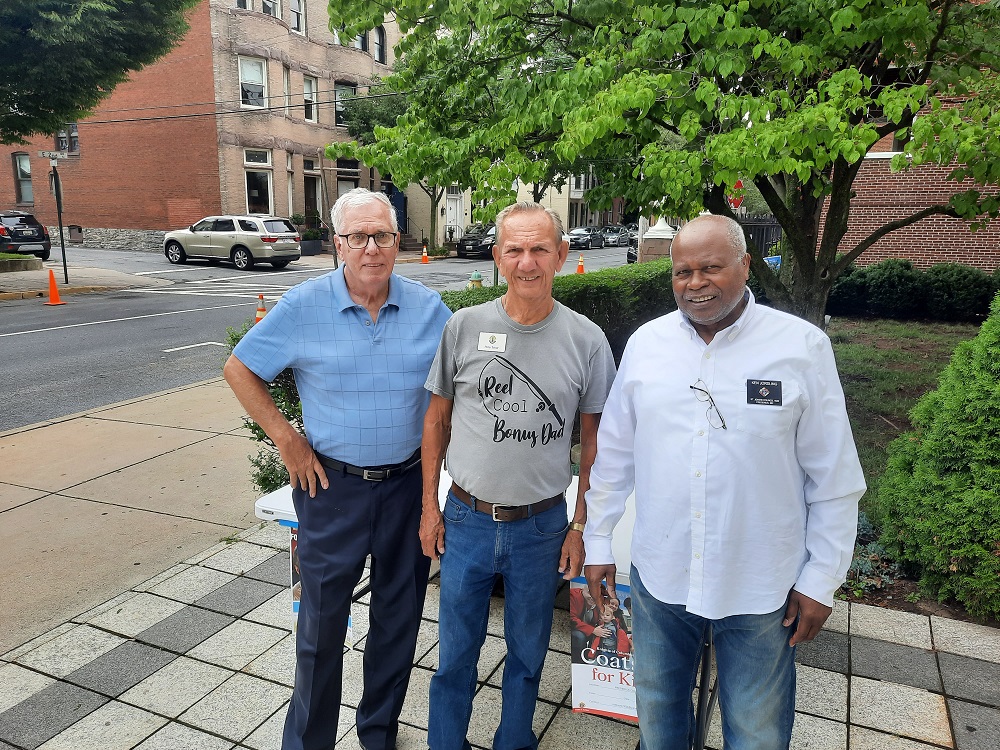 July 11, 2021, Council members hand out flyers after Mass at St. John the Evangelist Church, Frederick, MD. Their flyer is from the Saint Elizabeth Ann Seton Chapter of Grand Knights, which serves Grand Knights in Western Maryland, and seeks donations for two worthy charities, (1) a food program to pack 40,000 meals for distribution to schools, orphanages and needy families, and (2) "Coats for Kids" which donates winter coats to needy kids each Fall through school administrators.