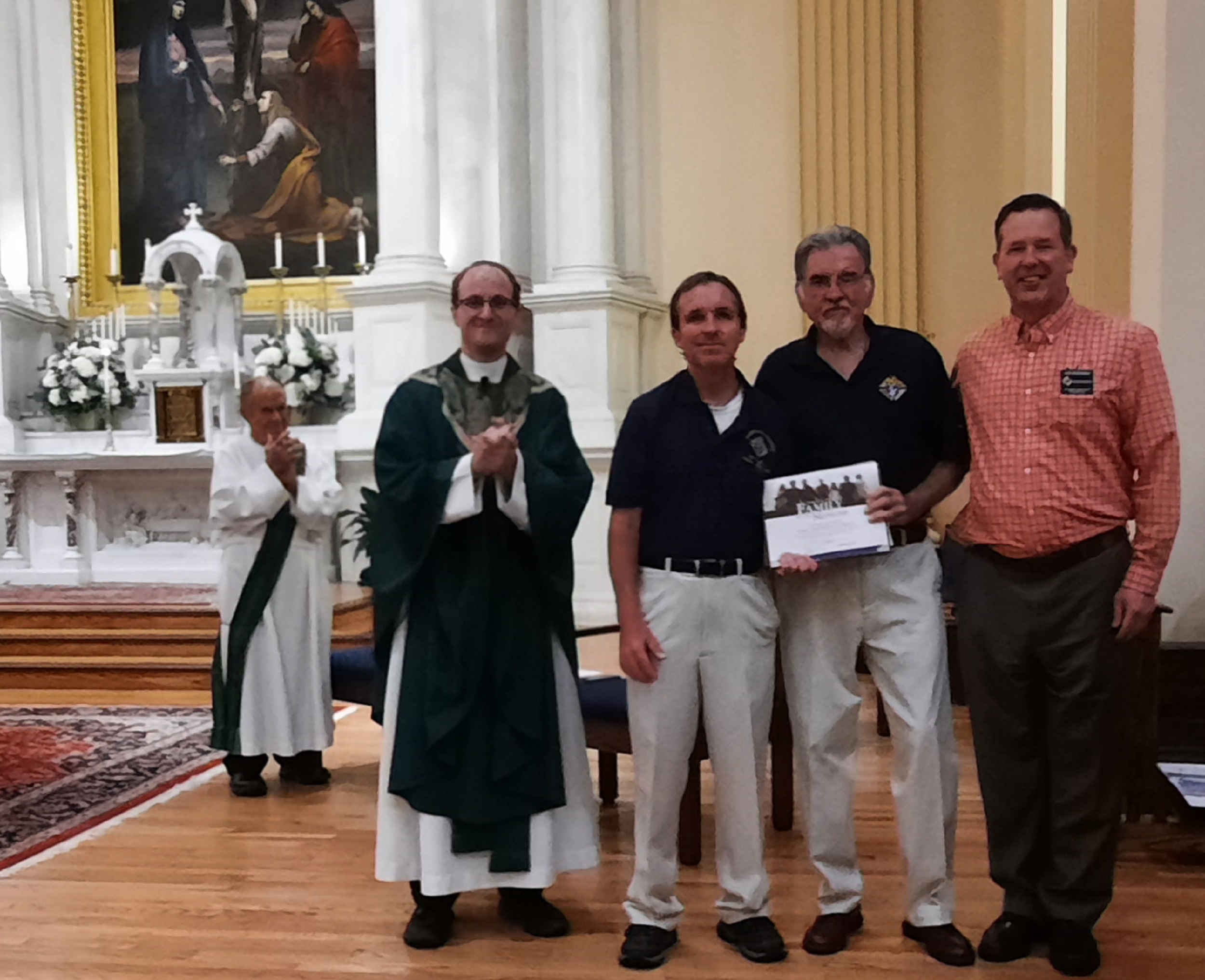 (LtoR) Deacon Skip Manley (in rear), Rev. John Streifel, Br. Robert Schneck (son), Br. James Schneck (father), and Grand Knight Lee Ericksen.