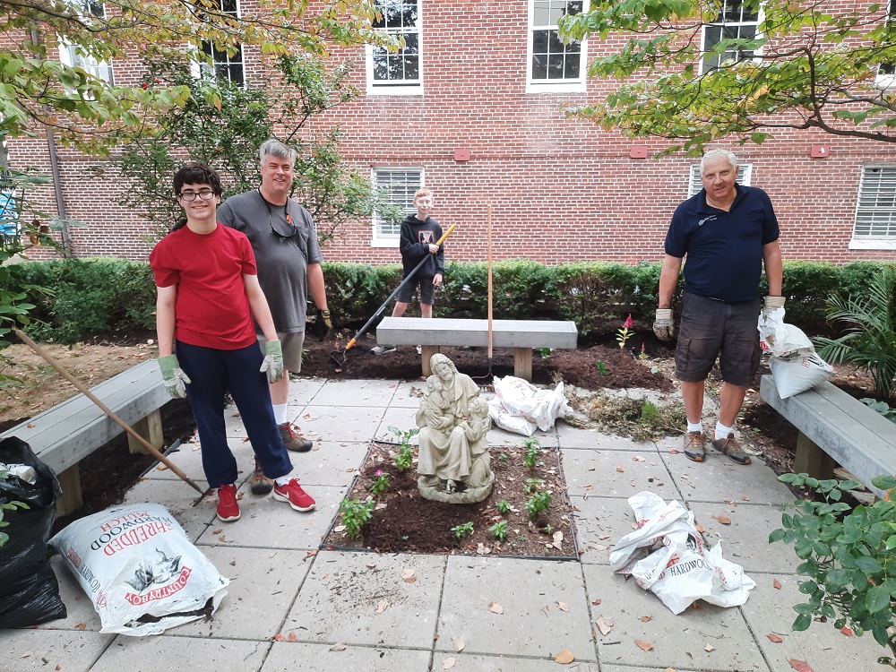 October 9, 2021, Knights, a Knight's spouse, Boy Scouts, and Scouters teamed up today to finished the mulch work at St. John the Evangelist Church and rectory. Another great effort.