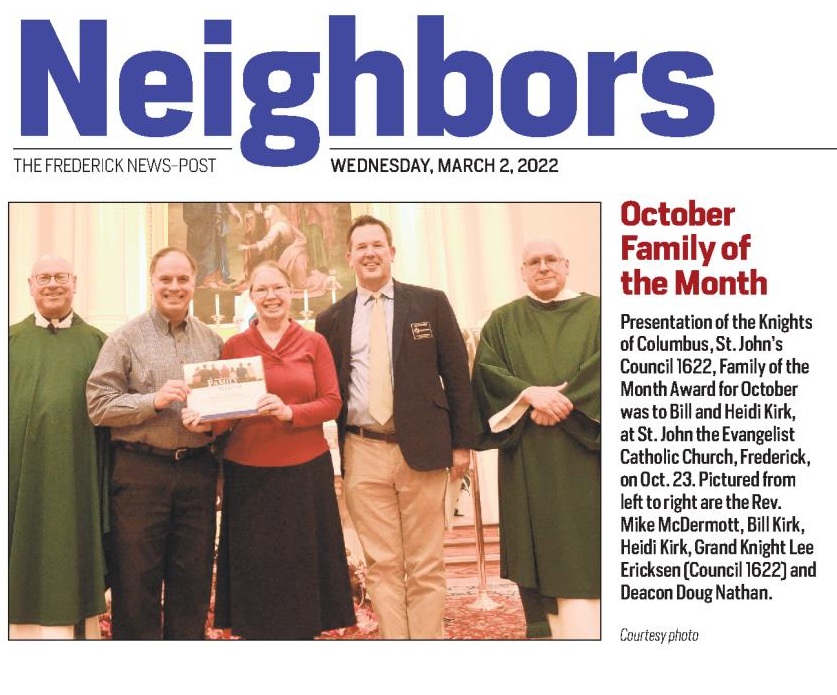 October 23, 2021, Presentation of the Knights of Columbus, St. John's Council 1622, Family of the Month Award for October to Bill and Heidi Kirk at St. John the Evangelist Catholic Church, Frederick, MD.